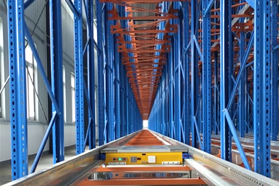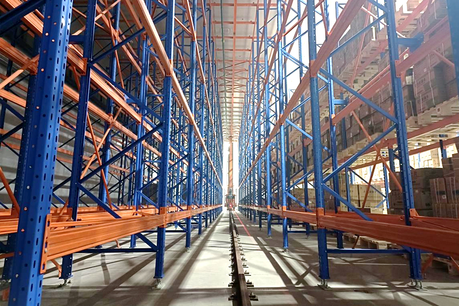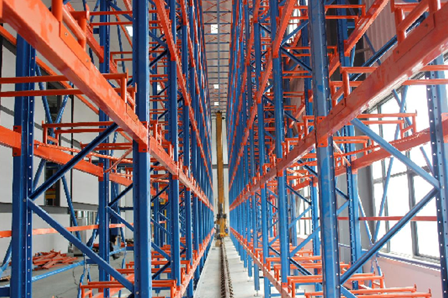本方案總貨位1630個,長30m,寬11m,高8m。由貨架、天地軌、直式巷道堆垛機系統(tǒng)、輸送線系統(tǒng)、WMS、WCS系統(tǒng)等組成。貨架采用橫梁組合式,4個巷道9排25層;5列24層+7排2列13層,堆垛機采用雙立柱地面支承形式。提高5倍以上倉儲空間面積。
